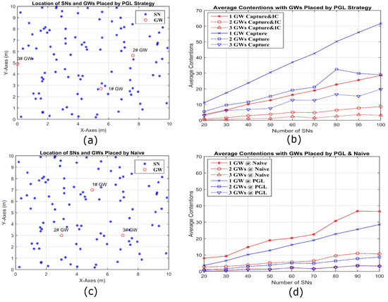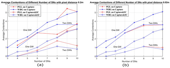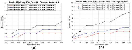Here, a desired contention level is specified for each given number of SNs. Then, the minimum required number of GWs to reach the desired contention level is determined, using the PGL algorithm, as shown in Figure 16a,b. Among the three desired average contention levels, 10, 30 and 50, the contention of 10 is a more strict requirement in 500 SNs than that of 50, which requires five GWs for 500 SNs compared to two GWs for the same number of SNs with capture and IC. On the other hand, with capture only, 15 GWs are required to get desired average contention levels of 10 with 500 SNs compared to five GWs at the same contention levels for capture and IC.