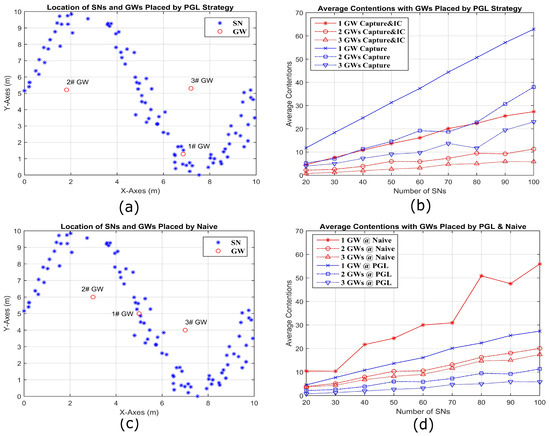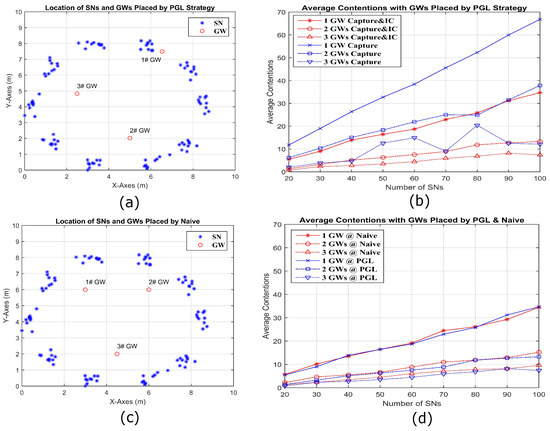Simulation visualizations for three GWs placed by PGL (a) and by naive placement (c) in the circumference composed by 100 SNs in a uniformly random distribution. (b) The average contentions comparing in different number of GWs by capture and IC to capture only separately; and (d) the average contentions for capture and IC comparing in different number of GWs placed by PGL and naive.
