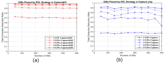 In this section, we consider the total contention reduction ratio by optimal placing of 1–5 GWs placed by PGL algorithm with capture and IC and capture only (Figure 15, which presents a comparison to Ref. [8]). The contention reduction ratio is defined , where N is the total number of SNs and is the average contention. We note that is the contention of a SN when no capture is possible; in this case, any interference level is enough to prevent a packet from being decoded. The contention reduction ratio can be interpreted as the average fraction of SNs whose colliding packet will not cause a given SN’s packet to be lost. A perfect contention reduction ratio would be 1, which would mean that no SN’s packet would be lost in a two-way collision with any other SN’s packet. In this simulation, the number of SNs is increased up to 500 following a uniform random spatial distribution in a 100 m × 100 m area with the 1 m × 1 m pixel density. It is shown obviously in Figure 15a that a small number of GWs placed by optimal algorithm of PGL with capture and IC can decrease the contentions significantly. In other words, many deployed GWs is not necessary for some network layouts. For example, two GWs can reduce the contention level to above , and 3–5 GWs provide little additional benefit on reducing the contention level. Therefore, the optimal number of GWs can be decided in the network infrastructure, based on this algorithm and other requirements.