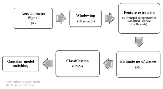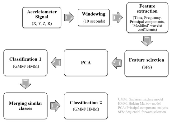 Tri-axial accelerometer data (X, Y and Z axes) were collected at a sampling rate of 100 Hz, during which the participants had to stay still for the first 5 seconds, and then perform a specific PA for a fixed period of time. As a part of pre-processing, the resultant acceleration, , was calculated and used as a fourth signal along with the X, Y and Z direction acceleration signals. After the activity transitions were identified from observed labels, the four acceleration signals were divided into windows of 10 seconds (1000 samples) without overlap, which is enough to capture both stationary and properties of the signal. To find descriptors of unique PA, various features were extracted from windowed accelerometer signals, followed by a feature selection method. Supervised classification was performed using the Gaussian mixture model (GMM) and the hidden Markov model (HMM), and their performances were compared. The entire lab-based process chain is shown in Figure 1.