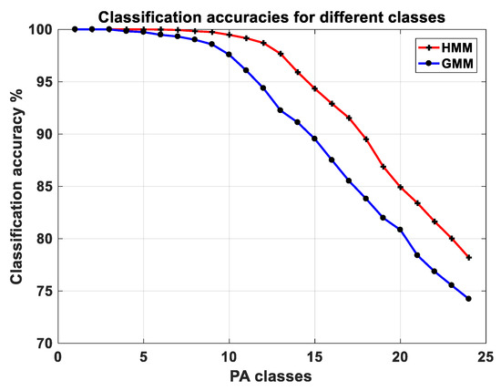 Convergence characteristics of each classifier (GMM and HMM), comparing the classification accuracies, as a PA class is merged at every step.