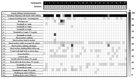 Free-living analysis results, showing the proportion of identified PA for each participant in each session; each column represents a session, showing the percentage of time spent on unique activities (out of 24 lab-based PA) by a participant in that session.
