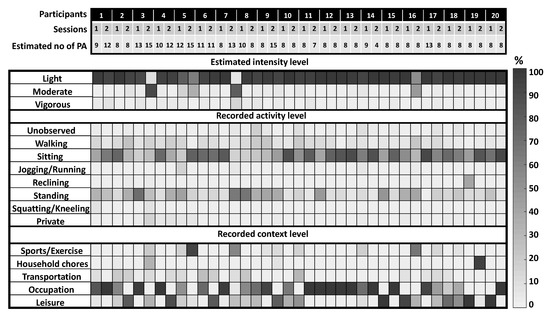 Free-living analysis results, showing the estimated number of PA and intensity levels (estimated), the observed activity types and contexts for every participant in each session. Results are shown in the form of percentage of time spent on each type of activity in a session. For example, participant 1 performed more that 90% of his 1st session performing sedentary or light intensity physical activities (estimated), and from the observed labels, it can be seen that he performed sitting and standing activities for more than 90% of the time, which was mostly during his workday.