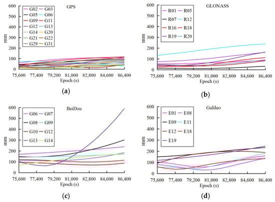 3D RMSs between the predicted ultra-rapid orbit based on WHU and the rapid orbit of GFZ during 24 h: (a) GPS, (b) GLONASS, (c) BeiDou, (d) Galileo.