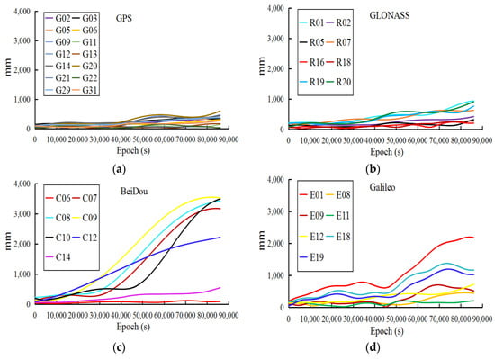 Table 7 shows the correction results of the different satellite systems under different schemes and the corresponding number of stations. However, note that the list of stations did not change during the month for the orbit determination experiments. Moreover, the list of stations from different schemes were re-selected to ensure the reliability of the experiment results before determining orbit solutions. Moreover, in Table 7, the orbit determination of the amplification factors 5% and 10% with the same stations for BDS show an increasing 1D RMSs, which produces changes in the parameter values related to the orbit, such as the troposphere and station clocks, based on different stations of other systems.