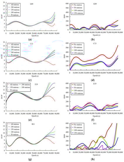 DOP values and orbit accuracy of different schemes with different number of stations of last 3 h for each epoch (30 s interval: (a,b) G09, (c,d) C13, (e,f) E19, (g,h) R11).