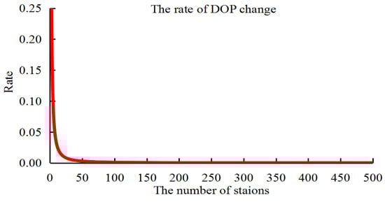 To take into account timeliness and accuracy of the ultra-rapid-orbit determination, the geometrical configuration between tracking stations and the satellites must be an optimal or sub-optimal distribution. According to previous research [,], there is an exponential relationship between the number of stations and the DOP values in the orbit determination. To weight the contribution of a single station in the parameter estimations, this study defines the amplification factor of the DOP values, specifically, the impact of a single station on the overall DOP values [],