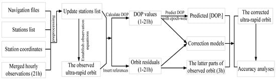 The specific steps of the above simulation experiments are shown in Figure 5. In this study, the results of orbit corrections with 10-days (DOY 141–150, 2016) of the orbit determination were calculated. Figure 6 plots the 10-day results of the observed ultra-rapid-orbit correction during the last 3 h and the corresponding 3D RMSs before and after improvement. Furthermore, the improvement rate of the orbit accuracy before and after correction for different systems are listed in Table 5. To show more details regarding the effectiveness of the orbit correction method, the predicted DOP values (24 h) and the corrected results of C13, E19, G09, and R11 on DOY 141 were plotted (Figure 7; only the last 3 h of the observed parts are given).