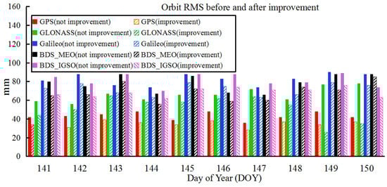 10-day (DOY 141–150, 2016) 3D RMSs of the GNSS observed orbit for the last 3 h based on improvement and not improvement method.