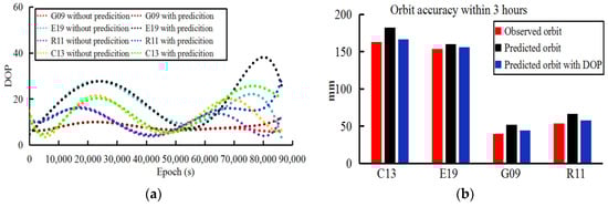 Orbit accuracy before and after correction of the last three hours and the corresponding DOP values on DOY 141: (a) DOP values with and without prediction, (b) orbit accuracy based on observed, predicted and correction, respectively.