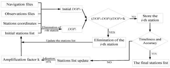 where DOPi indicates the DOP values based on all stations except the i-th station, and DOP0 represents the total DOP values before elimination. Note that, given the same distribution of stations, the more stations there are, the smaller are the DOP values. Moreover, in Equation (15), DOP0 is one more station than DOPi. Therefore, DOPi is always than DOP0 in Equation (15). Based on different amplification factors of the DOP values, the main steps to optimize the tracking stations distribution are the following: