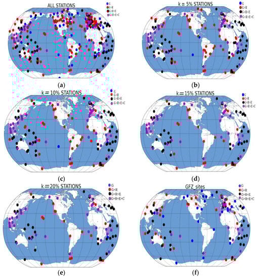 Distributions of stations for the different schemes: (a) all stations, (b) 5%, (c) 10%, (d) 15%, (e) 20%, (f) GFZ_sites.