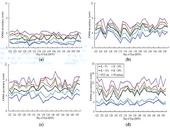 To analyze the effect of the station optimization methods, this study set the amplification factors to 5%, 10%, 15%, and 20%, in sequence. The list of GFZ is chosen as a reference to compare the station optimization schemes. Similarly, the observations of 409 stations downloaded by the ACs were included in the experiments. Figure 9 shows the global distributions of the different schemes. For each scheme, the orbit correction method based on the DOP values proposed in this study was used to assess the optimization strategy.