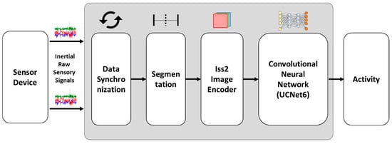 Table 7. Average accuracy comparison between Iss2Image-UCNet6 and existing methods on the DaLiAc dataset. - UCI-HAR dataset: For a fair comparison, we benchmarked our proposed method with a sliding window size of 2.56 s and 50% overlap. The comparison results are reported in Table 8. In [52], the authors extracted 17 features measured in the time and frequency domains for both accelerometer and gyroscope data and classified the activities using a MultiClass SVM (MC-SVM). Additionally, they developed another lightweight version with fixed-point arithmetic for energy efficiency. The accuracy of the standard version and lightweight version of the MC-SVM is acceptable, approximately 89.30% and 89.00%. The authors of [19] proposed a HAR system using deep learning neural networks, entering the accelerometer and gyroscope sensor data after some preprocessing steps. To improve performance, those convolutional networks were combined with an MLP. This combination strategy produced 94.79% recognition accuracy on average. Another strategy described in [19] combines the features extracted from the convolutional layers with the features extracted by FFT. That strategy improves on the first strategy, with an average accuracy of 95.75%. The authors of [53] proposed a hierarchical classification named GCHAR which has two stage classification. The first stage is group based classification, dividing similar activities into a specific activity group. The second stage is context awareness based, correcting the activity to be included in the proper group from stage one. Comparing with six other traditional classifiers, GCHAR showed the highest accuracy of 94.16%. With our Iss2Image-UCNet6 method, the accuracy suffered from decreasing the window size from 3 s to 2.56 s, so in this experiment, Iss2Image-UCNet6 achieved an average accuracy of only 96.84%, but that is still better than the other methods. Our method is much better than the MC-SVM, whereas the accuracy improvement over Convnet is not significant. These results show the power of deep CNNs in classification tasks.