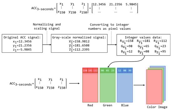 In this subsection, we will show the method using the ACC signal for example. The input to CNNs must be in an image form, a gray-scale or color image, with the pixel values represented as integers from 0 to 255. However, an ACC signal value is a real number containing both integers and decimal places, so it cannot be directly input into a CNN. Therefore, we here propose a novel encoder to efficiently transform raw ACC signal data into image data. We divide each ACC signal value (a real number) into three parts: the integer, the first two decimal places, and the next two decimal places. The three parts are separated and represented using decimal digits that correspond to the three color channels (red, green, and blue) of a color image. In that way, our proposed technique extends the dimensions of the original 1D ACC signal data into 3D image-type data. Every ACC signal value is modified, with the output represented as integers. For example, if one second of an ACC signal contains 150 values (50 X signal values, 50 Y signal values, and 50 Z signal values), each second of the encoded ACC signal contains a total of 450 integer values. If there are fewer than four decimal places, the missing places are set to zero. On the contrary, the ACC signal value will be rounded up to four decimal places.
