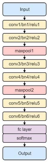 In this section, we contribute a CNN model for the deep learning HAR classification task after the input of an image. Each activity sample D is represented as an activity image I after applying our proposed encoding technique. In our method, the inertial sensor signal based HAR task becomes an activity image classification task using the deep learning technique. Therefore, the CNN model presented in this paper is generally designed to be suitable for image recognition. In particular, our CNN model, namely UCNet6, includes six convolutional layers in addition to the batch normalization layers, rectified linear unit (ReLU) layers, max pooling layers, fully connected layer, and softmax layer. The architecture of our CNN model is shown in Figure 3 and summarized in detail in Table 1.
