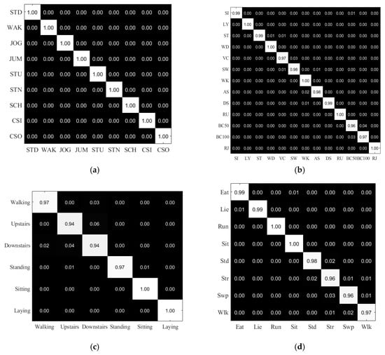 In the first experiment, we evaluated our proposed method on the MobiAct, DaLiAc, UCI-HAR, and UC-HAR datasets. The recognition results are presented as confusion matrices in Figure 4 and summarized as average recognition accuracy in Table 3. With the MobiAct dataset, our method yields 100% recognition accuracy on the test set. The three remaining datasets are more challenging, but the overall accuracy is still impressive, with 98.9%, 97.11%, and 98.02% accuracy on the DaLiAc, UCI-HAR, and UC-HAR datasets, respectively. With the DaLiAc dataset, our method misrecognized some activities in the same group, for example, vacuuming with sweeping in HOUSE and bicycling 50 W with bicycling 100 W, because of the similarity of those activities in a realistic environment and the inhomogeneity of the actors.