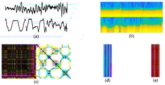 An illustration of activity images generated by (a) raw signal plot, (b) spectrogram, (c) recurrence plot, (d) multichannel, and (e) Iss2Image.