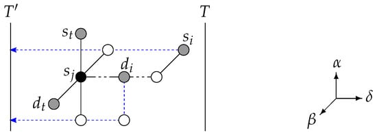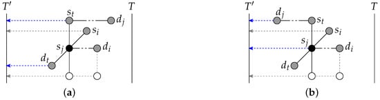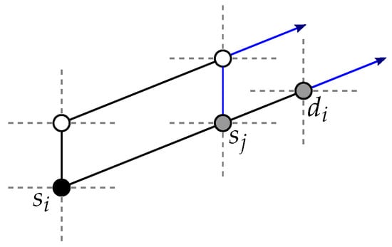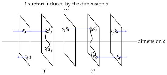 - Find a subtorus such that the following three conditions hold:In other words, subtorus either includes no source vertex and no destination vertex, includes at most one source vertex and no destination vertex, includes at most one destination vertex and no source vertex, or includes one single source vertex, say , and one single destination vertex .The selection of subtorus sets dimension to reduce the original (n, k)-torus to a set of k (, k)-subtori.