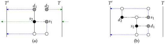 The vertices of pair , say , are first routed to without going through T. Since , there always remains at least one path disjoint with the vertices of the other pair to route towards . For the second pair , the paths of to may fully block (i.e., not routable as per Lemma 1 to T without going through ) one or both vertices of . If one single vertex of , say u, is fully blocked, route u towards T by going through with the path to T through . This path q always remains unblocked since, for u to be fully blocked to T, one vertex of , say v, is on to T, blocking two candidate paths to T for u, and the other vertex is in , precisely the neighbor of u that is opposite to the neighbor of u that is included in the path to for v. Hence, path to T through is always disjoint with the paths to selected for . Since with the selection of , and by the selection of the path q, subtorus includes one single vertex of the path q. See Figure 8a. If both vertices of are fully blocked by the paths to for , it means that and that are blocking both and towards T. Hence, route instead to (with to ) and to T (with to T). See Figure 8b.