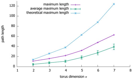 By using this computer implementation, we have repetitively and automatically solved a large number of random instances of the pairwise disjoint-path routing problem in a torus. Precisely, in an (n, )-torus, we have solved for each value of n () a total of 10,000 random routing problem instances. For each of these instances, the correctness of the selected paths has been checked (e.g., path disjointness), and the maximum length of the selected paths was stored. Then, for each value of n, the average of the stored maximum path lengths for this value of n was computed. Hence, our results include for each n both the maximum and the average of the obtained 10,000 maximum path lengths. The number of vertex pairs was set to to maximize the routing difficulty. For each n, the maximum and average of the maximum path lengths are given in Figure 9; the theoretical upper bound on the maximum path length is also given for reference.