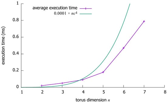 Empirical evaluation: average execution time to solve one problem instance with the proposed algorithm in an (n, )-torus.