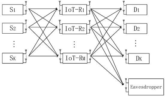 As the application scenarios in wireless IoT, the multi-hop relay networks consist of spatially distributed sensors or nodes, which enable IoT devices to collect and exchange data in relay manner. Since the broadcasting nature of wireless communications, this wireless IoT is more prone to eavesdropping []. Therefore, security is required, which can be accomplished by security approaches. Most of the security approaches for the wireless multi-hop IoT are deployed in the upper layers of the networks. However, nearly all upper-layer security approaches for IoT believe that the opponent or eavesdropper can obtain entirely control over a sensor or node by way of decoding cryptographic scheme []. Physical layer security technology, which comes from information theory to achieve perfect security [,,], is found to be more robust than upper-layer security approaches for the IoT with multi-hop relay connectivity [].