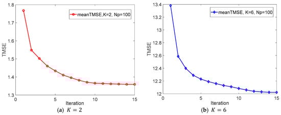 According to the mentioned above, we conclude that the TMSE is decreasing gradually with the updated  and  after each iteration. The TMSE converges to a constant after several iterations, which is also demonstrated by the Figure 2 of the Numerical Results part.