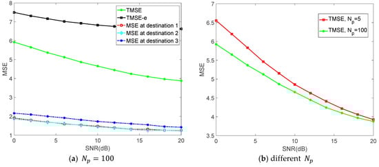 Figure 3 shows the changes of TMSE and MSEs at different destinations versus signal to noise ratio (SNR) with different , where we have , TMSE-e denotes the . As shown in Figure 3a, both TMSE of all destinations and MSE at different destinations decrease gradually as the SNR increases. It can also be observed in Figure 3a that MSEs at different destinations are very similar, statistically there is the nearly the same of the three legitimate links. Obviously, the TMSE of all legitimate destinations is much lower than the TMSE-e. It means that the system can be achieved a better transmission performance by employing our proposed algorithm against the eavesdropper. Additionally, Figure 3b shows that the TMSE of all destinations decreases when  increases. The reason is that the reduction of  causes the increasement of channel estimation errors, which in turn leads to the increasement of the TMSE.