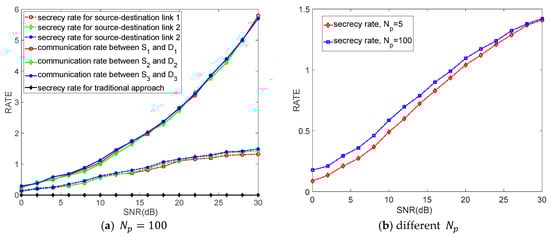 Figure 4 depicts the values of secrecy rate and communication rate versus transmission power constrains with different , when , which is in the same background with Figure 3. As shown in Figure 4a, compared to the traditional approach, the proposed algorithm can support a positive secrecy rate and secrecy rate gradually improves with the SNR increasing. In other word, our proposed algorithm guarantees secure communications for the system. According to Reference [], when the communication rate of legitimate transmitter-receiver link is lower than that of the transmitter-eavesdropper link, we define the secrecy rate as “0”; when the communication rate of legitimate transmitter-receiver link is larger than that of the transmitter-eavesdropper link, we define secrecy rate as the difference between the communication rate of legitimate transmitter-receiver link and that of the transmitter-eavesdropper link (as shown in (32)). The traditional approach does not consider the eavesdropper and the eavesdropper is so “sophisticated” (it knows our security algorithm) that the communication rate of legitimate transmitter-receiver link is lower than that of the transmitter-eavesdropper link. Consequently, no matter how large the SNR is, the secrecy rate is always zero. That communication rates of three links are similar, the situation of the secrecy rates is the same. Moreover, the achievable secrecy rates are lower than communication rates, because the proposed algorithm sacrifices a part of communication rate to realize a positive secrecy rate. Additionally, it can be observed in Figure 4b that the secrecy rate improves with the increasing of . This is because the increasement of  causes the reduction of channel estimation errors, which in turn leads to the increasement of secrecy rates.