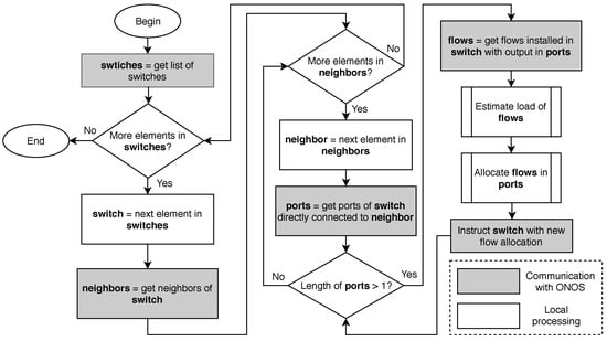The above description is the part of the SDN application that manages the packet forwarding in the transport infrastructure. It uses a customized flow definition, but spreads flows at random in the bundles between switches since there exists no a priori information about the flow rates, thus not performing any energy-aware optimization. Now, we proceed to describe how to optimize the energy consumption in the bundles. Figure 2 displays the flow diagram of the control application. The application performs the following tasks, some of them periodically:
