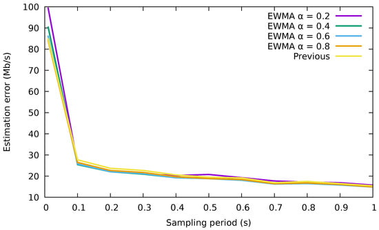 Clearly, using directly the measurements performs very similar to the usage of the EWMA for the different values of and the sampling periods studied. We can also notice large errors in the estimated rate for sampling periods lower than 0.1 s. This is due to the high variability of the rates for such a small time window. Therefore, we will directly use the rate of each flow in the previous interval to forecast its rate in the next interval, since it is a simpler method than the EWMA one and provides almost the same accuracy.