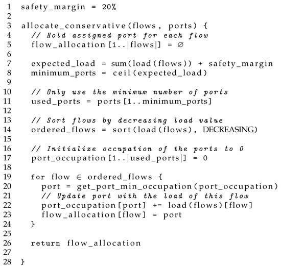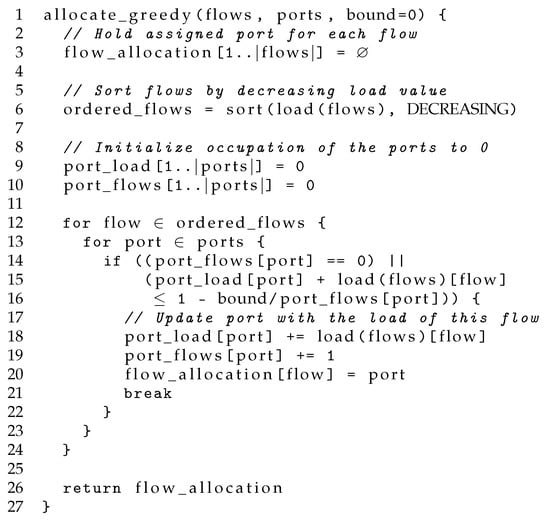 After determining the , the CA proceeds with the allocation of the flows attempting to achieve a balanced distribution of the flows to ports, both in terms of rate and number of flows. To accomplish this, the algorithm performs a minimization of the occupation of the ports. The pseudocode is shown in Figure 6, which first sorts the flows in decreasing order of their estimated rate and then sequentially allocates the flows to the port with the lowest occupation among those that will be used in the interval. Note that this algorithm is also capable of maintaining some ports idle, reducing energy consumption.