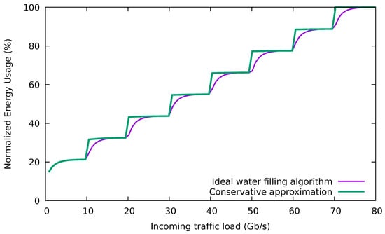 As a consequence, once a port reaches an occupation higher than 20%, it makes little difference for the energy consumption the actual traffic load assigned to it. Thus, the conservative algorithm (CA) prefers to have its used ports with a balanced traffic occupation avoiding the need for using the ports at full capacity in many situations, like frequently happens with the GA and BGA. Figure 5 shows normalized power profiles of an eight-link bundle with the ideal water filling algorithm and the power profile expected for the conservative algorithm.