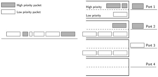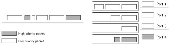 Clearly, the allocation of flows to ports is actually given by the energy-efficient algorithm, but thanks to the introduction of multiple first-in first-out (FIFO) queues inside the port, we prioritize flows with stringent QoS requirements in terms of latency, thus providing an expedited service. The decision of the next packet to be served by a port is straightforward: each time the port ends the transmission of a packet, it will pick the next packet to be transmitted from the non-empty queue with the highest priority. In other words, delay-sensitive packets have non-preemptive priority over the rest.