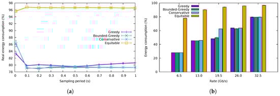 Figure 11a presents the variation of the packet loss rate with the sampling period for a 10,000-packet buffer size, while Figure 11b explores the packet losses introduced for different buffer sizes, using a sampling period of 0.5 s. GA was the one with the highest losses, followed by BGA, then CA and finally the equitable algorithm. These results confirm that the greedy algorithms can lead to high loss rates when the flow rates are underestimated. The conservative algorithm, however, was able to trade a small increment in energy consumption for an acceptable loss rate for buffer sizes from 1000 packets onward. Furthermore observe how for the highest sampling rates, packet losses diminished, as the algorithm adapted faster to rate variations; although, as seen before, energy usage also incremented.