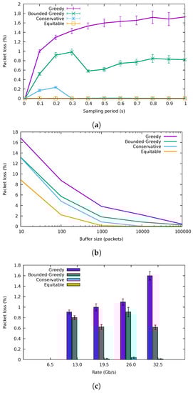 Packet loss rate. (a) Packet loss percentage variation with the duration of the sampling period. (b) Packet loss percentage variation with the buffer size. © 2018 IEEE. Reprinted, with permission, from [10]. (c) Packet loss for different traffic traces.