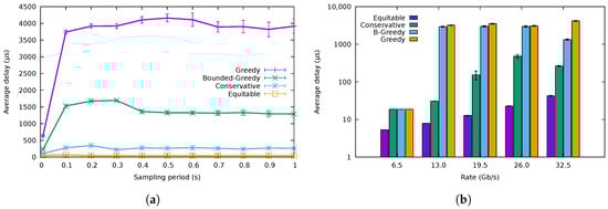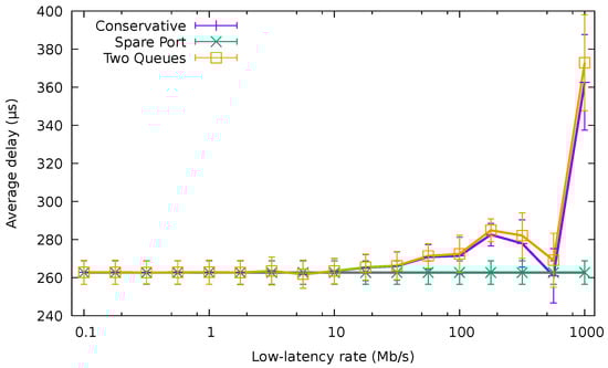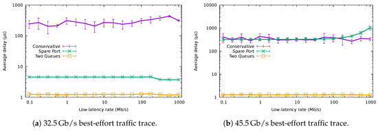 Figure 13a shows the average delay of the packets with low-latency requirements using the QoS-aware algorithms and that obtained using the baseline conservative one. The results in the figure correspond to the best-effort traffic trace of /, while we varied the rate of the low-latency traffic (We have omitted the results using lower rates for the best-effort traffic for the sake of brevity, since the results are analogous). The unmodified CA yielded considerably worse results than the QoS-aware algorithms, producing a delay higher than 100 μs. The fluctuations for the different rates of the low-latency traffic come from the fact that the low-latency flows would be allocated to a different port in each case, being forced to compete with a different amount of normal traffic.