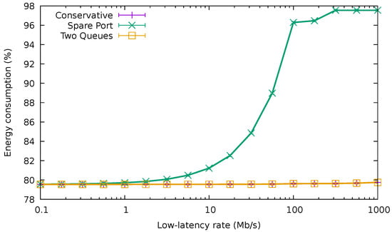 Finally, Figure 15 shows the average energy consumption of the bundle using the different QoS-aware algorithms and also CA in the same traffic conditions. Again, while the amount of high-priority traffic was negligible (i.e., lower than 10 /), the three algorithms drew the same amount of energy. As expected, TQA achieved exactly the same consumption as CA irrespective of the low-latency traffic rate. However, for values higher than 10 /, the energy usage increased rapidly for SPA, reaching nearly 100% for rates above 100 /. This confirms that energy consumption can rise quickly in SPA as soon as the amount of high-priority traffic forwarded in the spare port becomes significant.