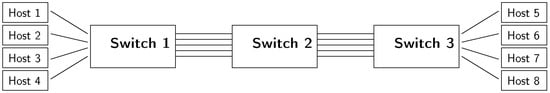 We have also validated the QoS algorithms with the ONOS application using the setup depicted in Figure 16. This time, the setup consisted of three switches (numbered from 1 to 3) and eight hosts (numbered from 1 to 8). Hosts 1 to 4 were connected to Switch 1 and Hosts 5 to 8 are connected to Switch 3. These edge switches were connected to an inner switch by their respective four-link bundles. All the interfaces in this scenario had a nominal capacity of 1 /.