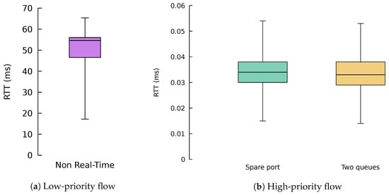 Figure 17 shows box and whisker plots with the round-trip time (RTT) of 10,000 packets of the lightweight flows using the different algorithms. The whiskers show that 95% of the samples and outliers have been removed for the sake of clarity. We can see that traffic without real-time requirements suffered a substantial latency in this scenario, around 50 . This performance is expected, since the flow was allocated in the same port and queue as the 600 / big flow. As a result, the packets of the small flows have to contend with the packets of the big flow, yielding considerable waiting times in the queue of the port, which are indeed the main contributions to this large RTT.