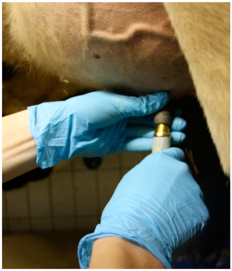The circular probe was manually placed in contact with the skin of the teat orifice (Figure 2). Measuring was automatically started upon skin contact and lasted on average two seconds. Contact between the sensor probe and the skin was regulated by the person who was conducting the measurements, who produced so little pressure that the animals showed no painful reactions. The measurement was repeated two times per teat, except in cases of failed measurements, for which a third measurement was performed. Afterward, the probe was cleaned with a dry cloth. Before pre-milking teat preparation, the same person took all the measurements with the MoistureMeterD to ensure standardized conditions.