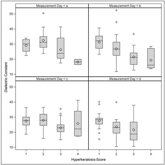 Distribution of the dielectric constant values across the four hyperkeratosis scores on each measurement day.