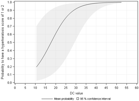 The probability to have a hyperkeratosis score of 1 or 2 depending on the measurement value of the dielectric constant (DC).