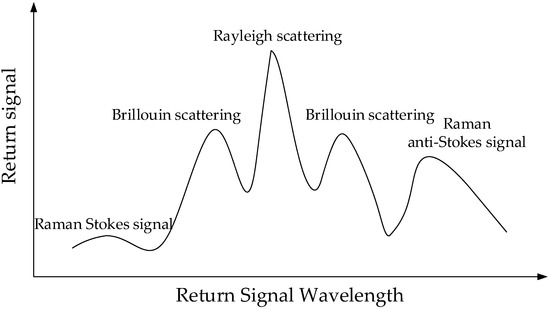 The incident pulse light will experience Rayleigh scattering, Brillouin scattering, and Raman scattering, as shown in Figure 1. Raman scattering is only sensitive to temperature and it is divided into Stokes and anti-Stokes scattered light. Anti-Stokes scattered light is sensitive to temperature while Stokes light is less affected by temperature, and the intensity of these two kinds of scattered light is in direct proportion to the temperature change [23]: