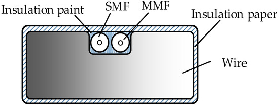 One kind of optical fibre composite wire structure is designed in this paper. A groove is cut in the centre of the wide edge of the wire. A single-mode fibre (SMF) and a multi-mode fibre (MMF) are put on the groove (Figure 2). The SMF is used as the strain-sensing optical fibre and the MMF is used as the temperature-sensing optical fibre. The fibres are fixed in the groove by insulating paint cured to ensure that the optical fibre and wire are deformed synchronously and at the same temperature. Since the optical fibre diameter is small and the area of the wire grooving is less than 2% of the cross-sectional area, the current carrying capacity and mechanical strength of the wire is negligible. Apart from the winding inside the transformer, there are mechanical parts such as the iron core, yoke, and clamping piece as well as interference factors such as transformer oil flow and machine vibration. Traditional electric measurements are usually affected by those factors mentioned above, thus the lower measuring accuracy; however, the inspection frequency of optical fibre measurements is usually above 10 GHz and is unaffected by the machine vibration signal. Meanwhile, the strain inspection optical fibre is integrated with the wire and is deformed synchronously with the wire, and the measured strain curve is only related to the deformation of the wire itself. To ensure the stable working of the optical fibre in high temperatures in the transformer, a high-temperature resistant optical fibre coated with a polyimide is used as it is stable at T > 200 °C.