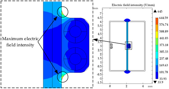 Since winding deformation mostly occurs in low-voltage windings, the wire used in the low-voltage winding of an SFSZ7-31,500/110 kV transformer is modelled to establish a 2-d groove wire model. The voltage grade of the low-voltage winding is 10.5 kV. The wire is 2 mm wide, 6 mm high, the groove is 0.3 mm both in width and depth, and the wide surface is covered in a 0.2-mm thickness of insulation paper. The optical fibre has a double-layer structure with 0.125 mm of fibre core diameter and 0.25 mm of coating layer diameter. As for the 10.5 kV low-voltage winding, the potential difference across two adjacent turns is about 40 V. The relative dielectric constant of each material is listed in Table 1. The inter-turn electric field of the wire after optical fibre installation is shown in Figure 3. It is shown that the maximum electric field intensity after the wire grooving is located at the round corner of the groove (644.59 V/mm), which is 119.6% higher than the inter-turn electric field intensity. The average value of the electric field intensity in the groove is 40% that of the inter-turn electric field intensity. It is far from being enough to affect the insulation performance of the oil paper.