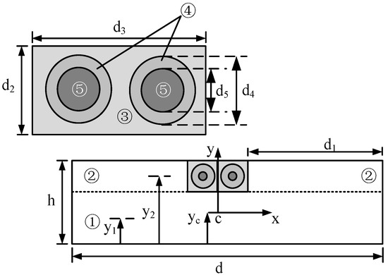 When the wire is subject to axial short-circuit action, the parameters of the embedded optical fibre wire are shown in Figure 5. The intersection of the axis of symmetry and the neutral axis layer of the model section is taken as the origin of the coordinates. To simplify the calculation, the wire section is divided into five areas and y1, y2, y3, y4, and y5 are the distances from the centroid of each part to the wire bottom, thus y2 = y3 = y4 = y5.