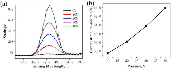 The fibre strain curve (a) and central strain transfer rate (b) under different pressures.