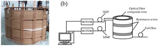 At present, fibre sensing technology has been applied in transformer detection, for example, fluorescent fibre measurements and quasi-distributed fibre temperature measurements using fibre Bragg grating (FBG) [19,20,21,22]. Reference [20] presents a method of combining fibre with winding wire. However, the above methods are all point temperature measurement, so the temperature distribution of transformer windings cannot be mastered comprehensively. There is no report on the inspection of temperature fields and strain in transformer windings based on the distributed optical fibre sensing technology.